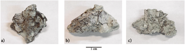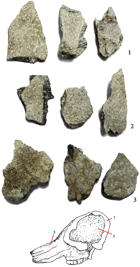 Samples of detached cortical bone, that was better conserved than the trabecular, were classified in three categories according to their anatomical position, color and porosity: 1- frontal bone with a white yellowish color in the anterior face, the internal side of the cortical bone has a brownish color, they both have low porosity and diagenetic alterations such as pitting and delamination; the pittings and surfaces losses were filled with a white material; 2- temporal bone with a brownish yellow color with more porosity and irregularities in the superficial area of the bone, the pores are filled with white and opaque mineral and with a translucent mineral. The internal face is black; 3- alveolus, the bone has a darker color and has more pores and other cavities which are filled with a white mineral. The internal face is black (Figure 4).