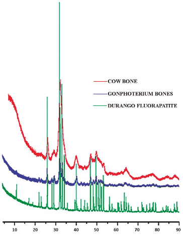 A detailed mineralogical study, using Powder X-ray Diffraction (PXRD) and Rietveld refinement, allow to characterized the differences between the tree categories to understand the permineralization of the bones and to identify the presence of diagenetic processes. For comparison purposes (Figure 5), we also use a pure inorganic well crystalized apatite (Cerro de Mercado, Durango fluorapatite), an actual bone of low crystallinity (cow bone composed by hydroxilapatite). We also measure with PDRX three samples associated with the sediments that covers the skeleton.