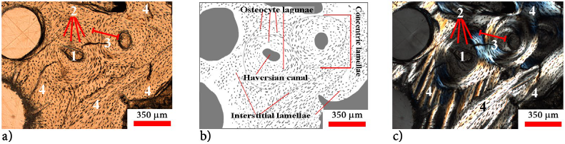 The cortical bone retained the normal micromorphology of mammal bones; Haversian system, osteons with the concentric lamellae growing around the Haversian canals and osteocyte lacunae were observed as well as the interstitial lamellae (Figure 6); bone reabsorption can be seen in Figure 7b-1 (Lamm, 2007).