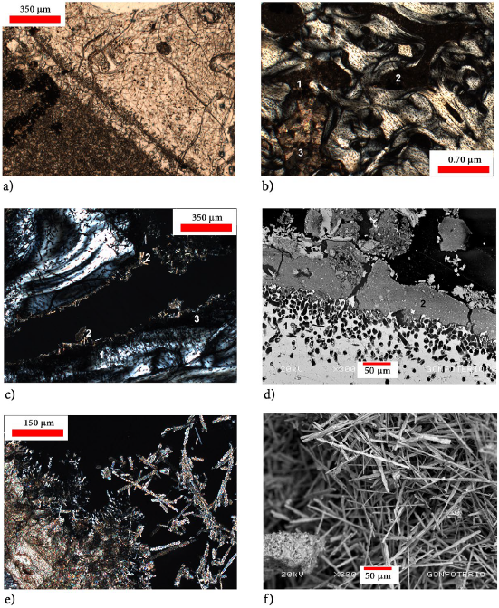 Precipitation and crystallization of secondary calcite in the bone voids: a) quick precipitation of micrite, b) slower crystallization of sparite in fissures and voids. Precipitation of fine layer of micrite in the bone surface and its transformations to needle fiber calcite (lublinite).