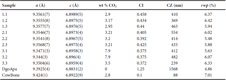 Rietveld refinement (Rietveld, 1967) was applied (using Highscore 4.5 PANalytical software) to calculate cell parameters and “XRD Crystallinity index” (Person et al., 1995). Crystallite size and CO2 content (O’Brien et al., 1990) were calculated to determine if the textural features observed in the petrographic study can be confirmed in a quantitative form using PXRD.