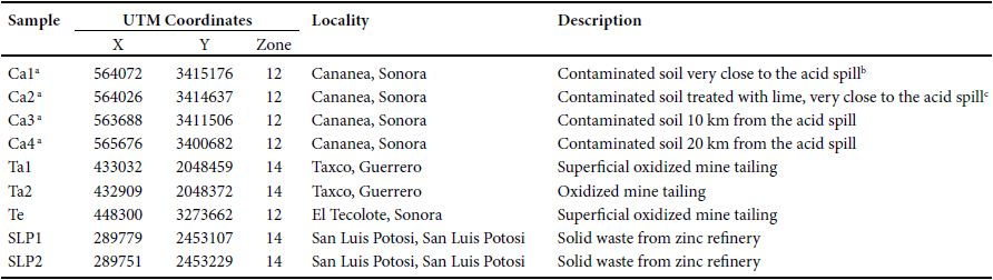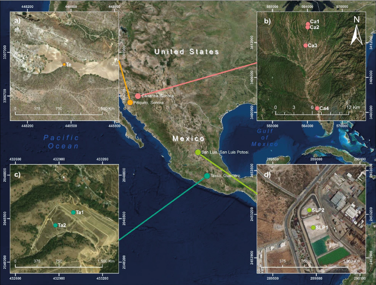 The areas studied are located in Mexico, in the northwest (Buenavista del Cobre mine, Cananea; and El Tecolote mine tailings impoundment, Pitiquito; both in the Sonora State); in the north central part (a Zn refinery in San Luis Potosi city); and in the south central part (El Fraile mine tailing impoundment, in Taxco, Guerrero). The sampled points are shown in Figure 1. In the case of the Buenavista del Cobre mine, soils were collected along the dry river bed. The climates of the areas are categorized as semiarid and arid, except for Taxco, which is temperate (INEGI, 2019).