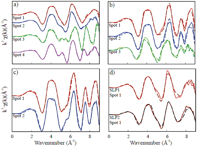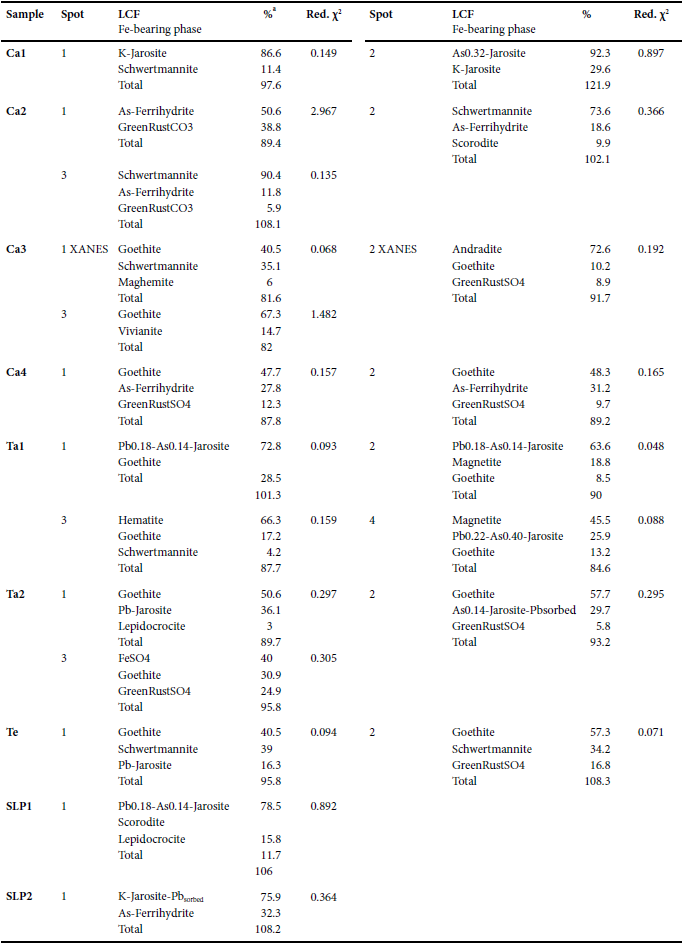 The major Fe phase found by XRD in the Ca1 sample is jarosite (Table 3). High contents of total Fe and Al were detected, as well as low concentrations of Ca and Mn, and much lower concentrations of various PTEs, among which those of Zn and Cu were the highest (Table 4). Most of the Fe is present in crystalline phases, and only 23% as poorly crystalline phases, which is consistent with the major Fe phases found by XRD reported above and by XAS (K-jarosite and an As-jarosite, Table 5 and Figure 2). Also, the yellow hue of the sample (pale yellow, 5Y 8/4) is consistent with the presence of jarosite (Lynn and Pearson, 2000; Schwertmann and Cornell, 2000). The EXAFS LCF indicates that the non-crystalline Fe mineral is schwertmannite, which was also detected as a possible trace mineral by XRD. The pH of 4.1 (Table 3) is expected to show an equilibrium transition zone where the stability shifts from jarosite to schwertmannite (Hayes et al., 2014), therefore, the spectroscopic findings and SSEs are all consistent with each other and with thermodynamic predictions (Bigham et al., 1996). Some As incorporation into jarosite is not rare, although the total As content is relatively low. These finding may be an artifact of the XAS spectral similarities between pure jarosites and As-jarosites (the probable presence of As or Pb in jarosite is not necessarily in the same proportion as in the jarosite standard used, however, the better fits obtained with these PTE-substituted standards may indicate the probable inclusion of these or other PTEs in the spot analyzed).