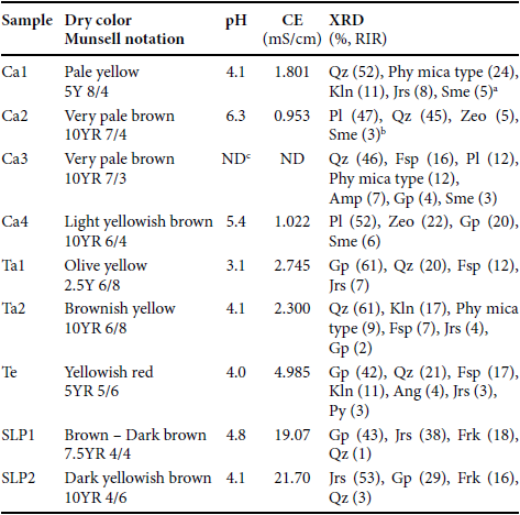 The samples were collected by the environmental geochemistry group of the Laboratorio Nacional de Geoquimica y Mineralogia, Instituto de Geologia (LANGEM), Universidad Nacional Autonoma de Mexico (UNAM) according to the mexican norm MNX-AA-132- SCFI-2006 (SE, 2006), from the top 5 cm of material; with the exception of Ta2, which was a combined sample of a mine tailings vertical profile collected from 40 to 180 cm in Taxco, Guerrero. The samples were air-dried and passed through a 2-mm round-hole sieve. The pH and E.C. (electrical conductivity) were determined in a 1:5 solid:water ratio following the ISO norm 10390:2005 (ISO, 2005) for the contaminated soils from the Sonora river basin and in a 1:1 ratio in accordance with Thomas (1996) for the samples from the mine tailings. All aqueous solutions were prepared with Milli-Q water (>18.2 MΩ・cm, Millipore). The color of the air-dried soil samples was determined in the laboratory using Munsell soil color charts (Munsell Color, 1975).