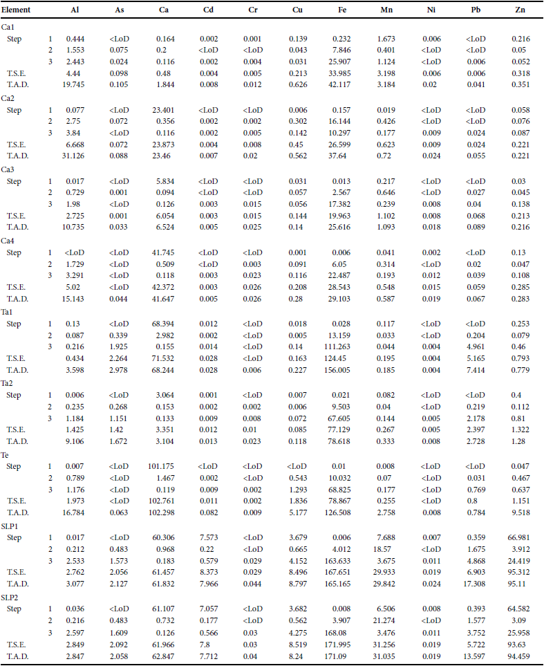 The PTEs: Cu, Mn, Ni, Cd, and Zn are present in high proportions in water-soluble forms in the sample close to the acid spill (Table 4, step 1); but soluble Fe is also quite high, which has to be in the (II) oxidation state. This means that redox conditions are not completely oxidizing, i.e., probably suboxic conditions prevail at least in certain areas of the soils sampled. This is not surprising considering that in the rainy season these samples are submerged under the running river. The E.C. (1.801 mS/cm) is related to the prevalent metal water-soluble sulfates. This shows that the soil of the Ca1 sample zone is polluted by the sulfuric acid spill, although the water-soluble levels shown are below the limits established by the Mexican regulations (NOM-147- SEMARNAT/SSA1-2004, SEMARNAT, 2007).
