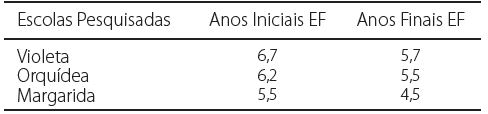 Considerando a impossibilidade de abranger todos os professores da rede, e tomando como importante aspecto de inclusão escolas com diferentes resultados no índice, optou-se pelo próprio IDEB como parâmetro de eleição das escolas partícipes da pesquisa. A amostra abarcou escolas com diferentes posições em relação à média da rede nos anos iniciais do Ensino Fundamental, sendo escolhidas para estudo uma escola acima da média do município (Escola Violeta), uma escola na média do município (Escola Orquídea) e uma escola abaixo da média do município (Escola Margarida) (Tabela 1).
