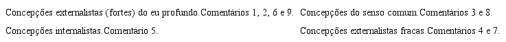 Da pré-análise, emergem as impressões iniciais que conduzem às demais etapas. A exploração do material, por sua vez, implica operações de desmembramento do texto em unidades, abarcando, também, o reagrupamento dessas unidades em categorias. Neste estudo, os critérios para esse agrupamento foram baseados na similaridade entre as representações. Assim, as representações construídas sobre o episódio foram alocadas em quatro categorias preestabelecidas, com base nas teorias sobre responsabilidade elencadas por Lenoir (2013): concepções do senso comum, concepções internalistas, concepções externalistas (fortes) do eu profundo e concepções externalistas fracas.