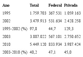Nesse período, a rede pública cresceu 56,25%, com destaque significativo para a rede federal que aumentou 83,47% e a rede privada 70,83%. Apesar da importante expansão da rede pública, a rede privada prevaleceu hegemônica. Assim, comparativamente ao setor privado, não houve alteração significativa na concentração de matrículas por dependência administrativa.