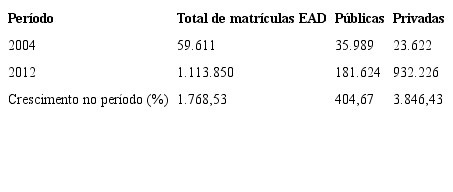 Verifica-se que em 2004, o setor público possuía maior concentração de matrículas da graduação a distância que o setor privado. No ano de 2012, o cenário sofreu uma total inversão. Assim, no período de 2004-2012, a rede pública cresceu 404,67% e a rede privada alcançou o fenomenal patamar de 3.846,43%. O setor privado-mercantil vem massificando essa modalidade de ensino, apesar da qualidade questionável de seus cursos, e inclusive, tendo direito a oferecer bolsas do Prouni.