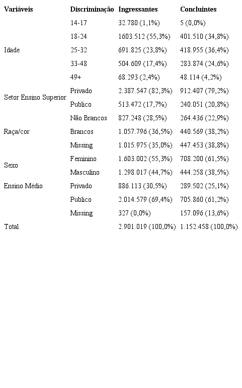 As mulheres formam a maioria (55,3%) dos ingressantes assim como estudantes provenientes do setor público de educação básica (quase 70,0%). Os dados sobre raça são muito difíceis de serem analisados em função do excesso de informações faltantes (mais de um terço do total). É impressionante a proporção de ingressantes no setor privado (82,3%). Ao mesmo tempo verifica-se que pouco mais da metade desses alunos estariam naquela que é considerada a idade adequada para cursar o Ensino Superior (55,3%). Todos esses dados, com a possível exceção da entrada maciça no setor privado, podem indicar algum nível de abertura no sistema brasileiro de Ensino Superior. Há mais mulheres, não-brancos e alunos do sistema público de Educação Básica. No entanto, o detalhamento e análise das condições institucionais permitem compreender melhor o sentido dessa abertura. Há variações importantes na distribuição dos estudantes por área de conhecimento e por categorias administrativas que merecem ser analisadas com maior atenção.