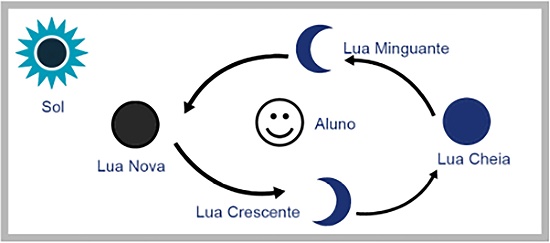 Para o experimento, tomou-se como referência as posições dos três corpos celestes: Sol (lanterna), Lua (bola) e Terra (aluno). O birô foi colocado no meio da sala, a bola na metade do birô (retangular), em cima de um copo descartável, e a lanterna em numa das extremidades do birô, na altura dos olhos do aluno. A Figura 1 serviu de referência para o aluno, como um motivador para esse entendimento.