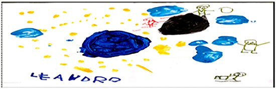 Nessa pesquisa, procurou-se comprovar que o desenho (estímulo visual) como precursor da escrita impulsionou o desenvolvimento verbal da criança. Com apoio em Vigotski, optou-se por partir do desenho para propor a atividade de produção textual. Pediu-se para ele desenhar um painel que representasse as fases da lua com os recursos da Sala de Recursos Multifuncional, como papel, pincel e tinta. A atividade foi realizada com autonomia e êxito, pois Leandro tem muita habilidade para artes, como é possível observar na Figura 2.