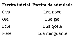 Verificou-se com esse experimento que o aluno, além de desenhar, escreveu as palavras “lua nova” convencionalmente, o que demonstra uma evolução da atividade da escrita inicial (linha 1 do Quadro 1). Em relação às palavras “lua gia” (cheia), ele ainda não conseguiu realizar o processo fonológico do fonema “ch”, mas escreveu a palavra lua. Também houve uma evolução na escrita de “lua qcte” (crescente). No entanto, em lua minguante, o resultado foi surpreendente devido ao recurso do vídeo modelagem.