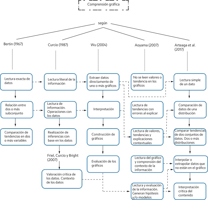 La primera propuesta taxonómica surge de Bertín (1973) a través de la cual se presentan tres niveles de lectura e interpretación gráfica. Posteriormente, Curcio (1989) distingue tres de lectura característicos de la comprensión gráfica según las habilidades desarrolladas. A diferencia de Bertín (1973), Curcio (1987) propone un modelo más específico lectura e interpretación a la cual Friel, Curcio y Bright (2001) añaden un cuarto nivel sobre esta taxonomía que involucra una comprensión más profunda del origen y el alcance de los datos. Años más adelante Wu (2004) define cuatro niveles cognitivos sobre la comprensión gráfica. En cada uno de ellos, se presenta ciertos rasgos específicos que los estudiantes deben desarrollar de los cuales presenta los dos primeros niveles equivalentes a Bertín y Curcio, con la diferencia de que incluye un tercer nivel relacionado a la Construcción de gráficos. En este nivel propuesto, el autor señala que los estudiantes que cuentan con este nivel de comprensión gráfica construyen, presentan o editan datos en forma gráfica. El ultimo nivel de Wu (2004) señala la evaluación de los gráficos y la información contenida en ellos. Es importante señalar que este nivel, aunque, en una menor o mayor escala, corresponde al último nivel complementado por Friel, Curcio y Bright (2001) así como los propuestos en años posteriores por Aoyama (2007) y Arteaga, Vigo y Batanero (2017). La característica principal de este nivel superior señala que los estudiantes ubicados en este nivel se caracterizan por evaluar un gráfico respecto a su exactitud y efectividad, así como la interpretación crítica de su contenido y su origen o contexto.