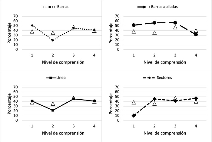 Por último, respecto al gráfico de sectores, los niveles 3 y 4 fueron los que obtuvieron mayores porcentajes de respuestas correctas y cercanos al promedio general por tipo de gráfico (41.4% y 46.7%). El nivel 2, estuvo ligeramente por encima de la media con 45.3% de respuestas correctas y, el nivel 1, fue el tipo de interpretación con menor porcentaje de aciertos (10.5%).