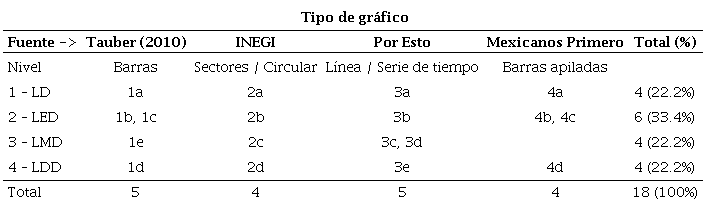 Las preguntas que se incluyeron en cada gráfico estuvieron orientadas bajo la taxonomía y niveles de Curcio (1989) y Friel, Curcio y Bright, (2001). Asimismo, se tomó en consideración el tipo de unidad que han utilizado expertos en el área, así como en el trabajo de Aoyama (2007) para clasificar sus niveles de lectura e interpretación de representaciones gráficas. En la Tabla 1, se estructura la clasificación de las preguntas por tipo de gráfico y por niveles de lectura. El estudiante visualizaba cada gráfico con una breve información del contexto, tal cual aparecía en la fuente, seguido entre 4 a 6 preguntas de respuesta abierta, clasificadas por los niveles taxonómicos de comprensión gráfica.