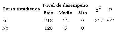 Por último, se clasificaron las frecuencias y porcentajes correspondientes a cada nivel de desempeño de la prueba. Los resultados indican que el 95.6% (n=346) de los participantes se encuentran en un nivel bajo, mientras que el 4.4% (n=16) se clasificó en un nivel de desempeño medio. No se encontraron niveles de desempeño alto. Sin embargo, las pruebas de hipótesis no evidenciaron un avance significativo entre los niveles de desempeño y haber cursado una asignatura relacionada a la estadística. En la Tabla 3 se presentan los niveles de desempeño en la prueba y su relación con el haber cursado o no alguna asignatura relacionada a la estadística durante la carrera.