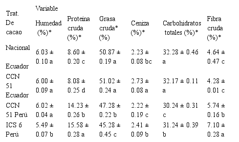 En el contenido de ceniza existe diferencia significativa (p≤0.05) entre los cultivares, siendo superior el material CCN 51 de Ecuador con 2.73 ± 0.08 %, y el menor para CCN 51 de Perú con 2.22 ± 0.19 %; otra investigación reporta valores de ceniza en cacao, en Mérida (Venezuela), mayores con 2.96 ± 0.05 % (Lares et al., 2012).