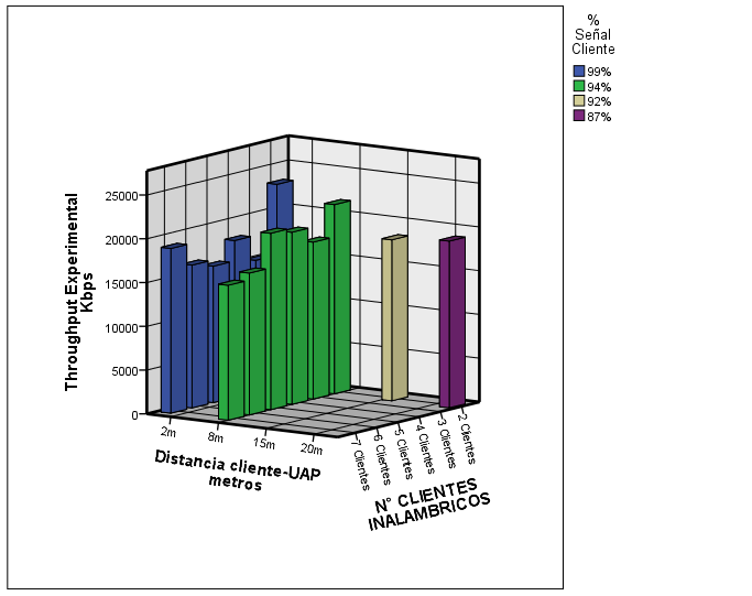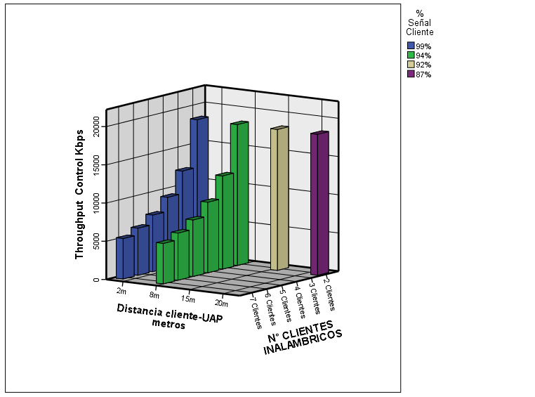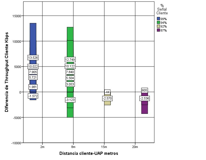 A partir de las condiciones del escenario de evaluación y de los parámetros de operación de los clientes y puntos de acceso, de estas gráficas se puede afirmar que la tasa de datos del cliente inalámbrico de la celda experimental supera ampliamente a la de datos del cliente inalámbrico de la celda control, hasta una distancia de 8 m del punto de acceso y con hasta 7 usuarios conectados en la celda.