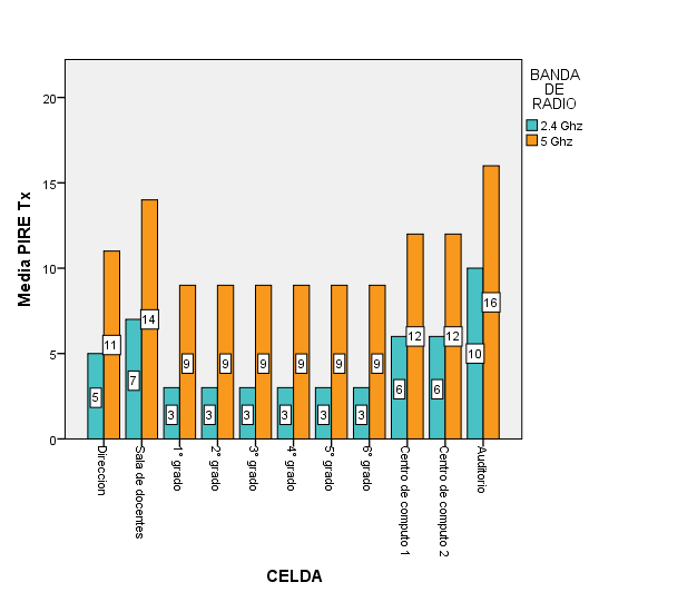 Para el cálculo del área de cobertura se consideró el radio de la celda, un margen de desvanecimiento mínimo de 25 % y señal de recepción del 99 %, y se obtuvo un PIRETx de 3, 5, 6, 7 y 10 dBm en la banda de 2.4G. En la banda de 5G se obtuvo un PIRETx de 9, 11, 12, 14 y 16 dBm, que se muestran en la Figura 3. Esta potencia mínima debe ser configurada en los puntos de acceso con el estándar IEEE 802.11n