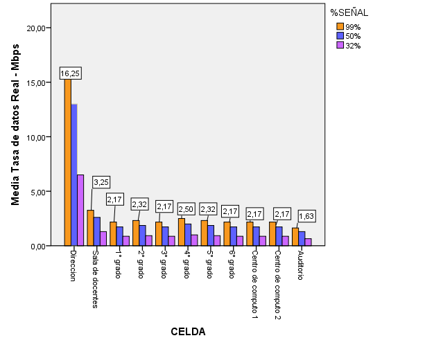 La tasa de datos teórico de la celda de control, la tasa de datos medida en campo de la celda experimental y la diferencia de tasas se muestran en las figuras 7, 8 y 9 respectivamente en kbps.