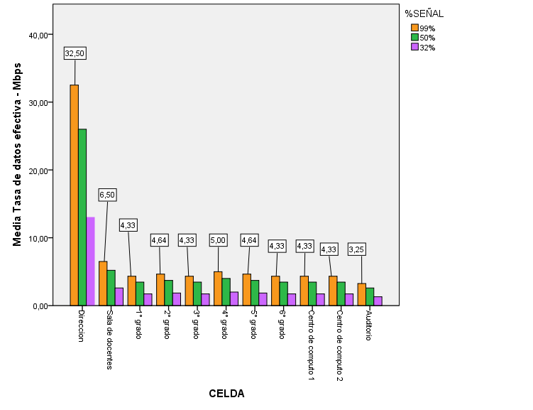 Para el cálculo de la capacidad en la banda de 5.8G, se consideró el # de dispositivos inalámbricos por celda, % señal de recepción del 99 %, 50 % y 32 %, y se obtuvo una tasa de datos efectiva máxima de 32.50 Mbps y una mínima de 1.30 Mbps, mostradas en la Figura 5. Para señales de recepción del 99 % se obtuvieron las tasas más altas. Cuando las estaciones inalámbricas operan en la banda de 5.8 Ghz, MIMO de 2x2, 802.11n y con 99 % de señal de recepción, se obtuvo una capacidad máxima por celda de 65 Mbps.