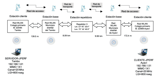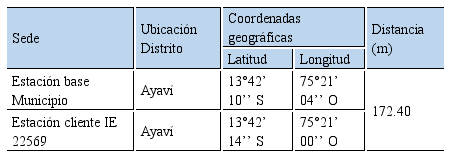 En la Figura 6, se muestra el escenario de evaluación del rendimiento de la red inalámbrica de banda ancha para interconectar la estación cliente IE 22048 (distrito de Tambo) con la estación cliente IE 22569 (distrito de Ayaví).