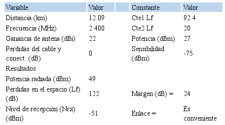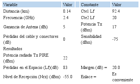 Se ha utilizado el software RadioMobile para calcular el perfil del radioenlace punto a punto entre la estación base y la estación cliente, mostrada en la Tabla 4. Para verificar la línea de vista entre ambos puntos para interconectar en ambos distritos, se ha asumido una ganancia de antena de 5 dBi, una potencia de transmisión de 17 dBm y una sensibilidad del receptorde -75 dBm en la banda de 2.4G, y se obtuvo un margen de desvanecimiento 20 en ambos distritos, lo que garantiza una disponibilidad de servicio del 99.9 %.