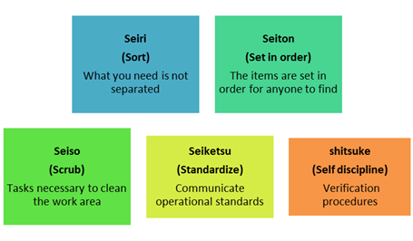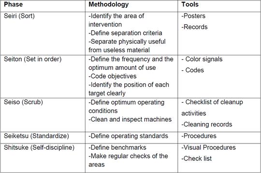 The first Lean tool used was 5 S, authored by Hiroyuki Hirano and refers to the creation and maintenance of cleaner work areas, more organized and safer (Cantú, 2011). Encourages group participation of all involved in the process, which improves working environment and productivity (King, 2005). Figure 1 shows the five issues addressed in this paper.