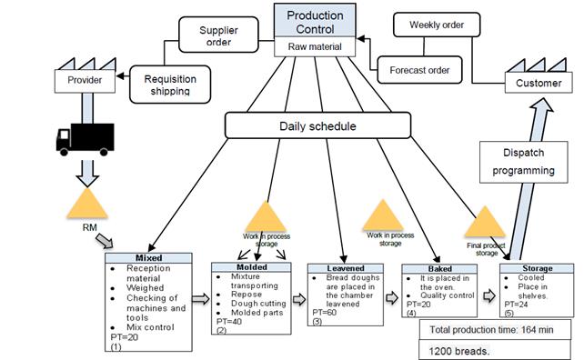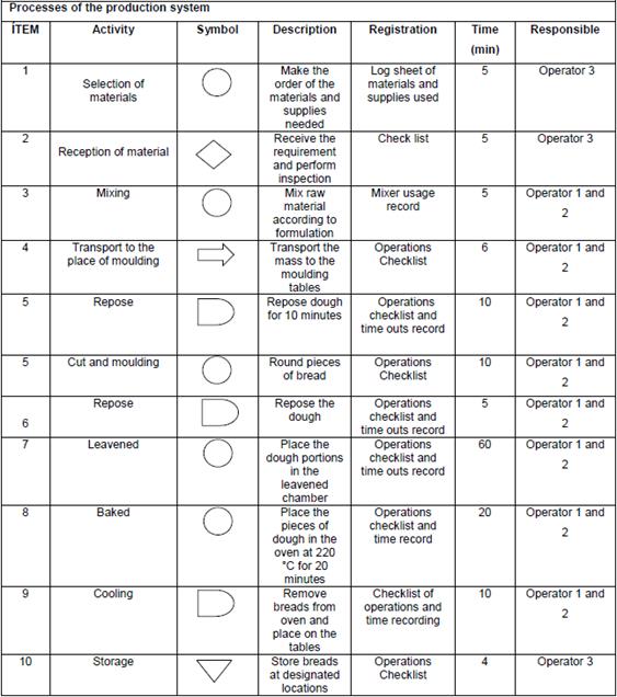 Figure 3 shows a detailed description of the operations involved in the transformation of raw material set at the factory to obtain the finished product, further describes the material and human resources involved in the production process; as well as the runtime and the respective control registers for each operation.