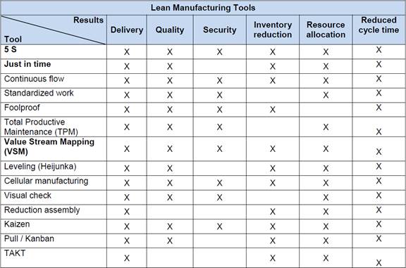 Moreover, there are fourteen tools attached to the philosophy of lean manufacturing, to carry out this work it was applied three of them: 5 S, just in time and value stream mapping (VSM), they are presented in Table 1.