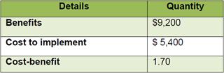 The implementation of lean manufacturing cost the company $ 5,400 while profit was $ 9,200, therefore it is possible to say that for every dollar that the company spent on implementing Lean methodology generated a return of $ 0.70.