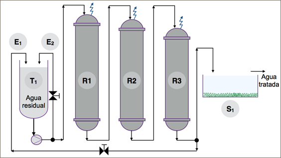 El sistema de biofiltración (Figura 1) consistió de tres etapas: (i) sistema de almacenamiento con aeración y distribución de agua residual, (ii) sistema de tres biofiltros en serie con microorganismos inmovilizados y (iii) sedimentación secundaria mediante zeolita activada. Desde el tanque de almacenamiento (T1) se distribuyeron 55 L de agua residual al sistema de biofiltros (R1, R2, R3) mediante bomba centrífuga. Cada lote de agua residual fue tratado en un tiempo máximo de 18 horas con mediciones de parámetros de calidad cada dos horas. La calidad del agua tratada mediante biofiltración solo fue medida en el biofiltro R3. El caudal de entrada del agua residual al biofiltro R1 fue de 3,5 L.min-1 y el de salida en el biofiltro R3 fue de 1,5 L.min-1. La temperatura promedio de trabajo fue 30°C y ésta se alcanzó con la ayuda de aislantes térmicos colocados en los biofiltros. La activación de la zeolita (Zeonatec, Ecuador) del tipo alumino-silicato de elevada hidratación se realizó a 250 °C durante cuatro horas con lavados constantes con agua destilada para eliminación de partículas contaminantes.