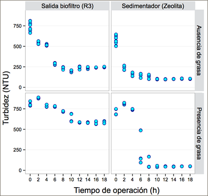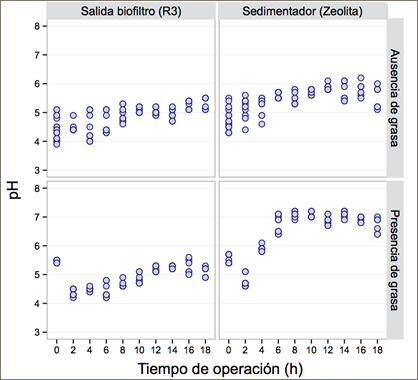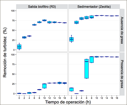 Los resultados del proceso de tratamiento mediante biofiltración de las Figuras 2 y 3 representan 120 mediciones de un total de 360 L de agua residual tratada. Los cambios de pH y turbidez fueron medidos en función de la presencia de grasa en un lapso de 18 horas de monitoreo continuo. En experimentos preliminares se determinó que la presencia de grasa en el agua residual tuvo un efecto positivo en la eficiencia del tratamiento. Por tanto, se evaluó su influencia tanto en la remoción de turbidez como en el cambio de pH a la salida del biofiltro R3 y después de la sedimentación secundaria con zeolita activada.