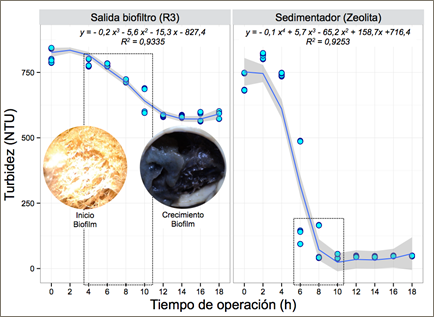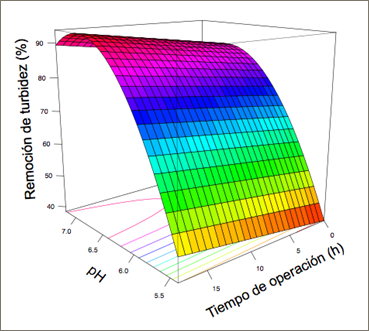 Según los modelos matemáticos de las Figuras 5 y 6 (R2 > 0,92 y p < 0,05), con presencia de grasa en el agua residual, 6 horas fue el tiempo mínimo de biofiltración lo cual generó una óptima sedimentación. Altas remociones de turbidez se alcanzaron cuando el pH fue neutro.