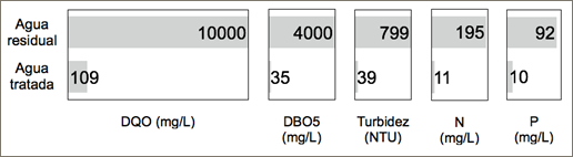 De acuerdo con los resultados obtenidos en las Figuras 2 y 3, del mejor tratamiento se evaluó la calidad del agua tratada a las 6 horas de operación, con presencia inicial de grasa y muestra tomada después de la sedimentación con zeolita activada (Figura 7). Se obtuvo una reducción de 98,9% de DQO, 99,1% de DBO5, 95,2% en remoción de turbidez, 94,4% en remoción de nitrógeno total y 89,1% en remoción de fósforo total. Todos los parámetros están por debajo de más del 90% de la normativa legal tanto ecuatoriana (Ministerio del Ambiente, 2008) como normativa internacional p.e. normativa alemana (Bundesministerium der Justiz und für Verbraucherschutz, 2004). La eficiencia del sistema de biofiltración es comparable con otros estudios donde se han obtenido entre 75 y 97% de degradación de DQO (Demirel, Yenigun & Onay, 2005). No obstante, cabe mencionar que procesos físico-químicos carecen de altos rangos de remoción de materia orgánica disuelta en comparación con procesos biológicos (Dawood, Kumar & Sambi, 2011).