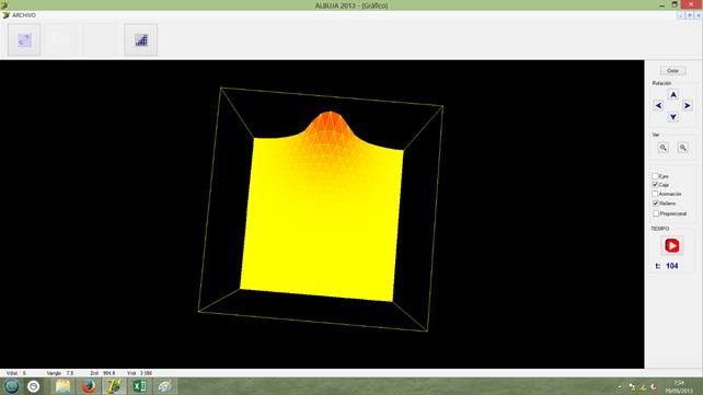 El simulador tiene dos maneras de visualizar los resultados, la primera, en la Figura 2, muestra el resultado en tres dimensiones es decir, usa la malla para graficar la función resultante. Lógicamente como es un problema evolutivo dicha función va cambiando en el tiempo, lo cual nos una buena idea de cómo evoluciona el fenómeno.