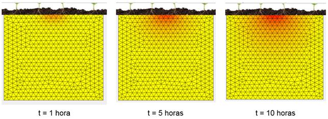 La segunda forma de visualización es en dos dimensiones es decir a cada posición (x, y) del plano le corresponde un código de colores que varía de amarillo que significa 0 contaminación, hasta rojo intenso, que es donde la función toma los valores más altos. Lo que implica una mayor contaminación. En el caso del fenómeno de infiltración de agua en el suelo se puede observar en un corte transversal como el fluido va poco a poco ingresando en el suelo. En la Figura 3, se aprecia tres gráficas del simulador en tres tiempos diferentes; después de 1 hora la infiltración de agua en el medio poroso es leve, después de 5 horas aumenta, mientras que al cabo de 10 horas los niveles de infiltración son muy considerables.
