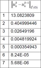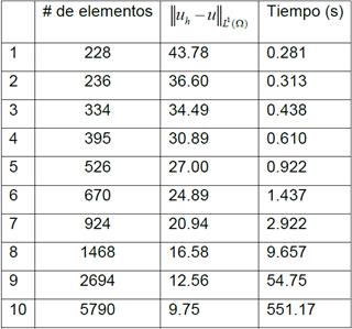 Adicionalmente, se deja constante el tiempo y variamos el número de elementos (triángulos) de la discretización espacial, se calcula el error con la norma de para lo cual se integran en valor absoluto la diferencia de la solución exacta y aproximada sobre cada triángulo y luego se suman., Con lo cual se obtiene una muy buena aproximación de esta norma. Así mismo se registra el tiempo que se demora la computadora en realizar los cálculos, y finalmente se registran los resultados, como lo muestra la Tabla 1.