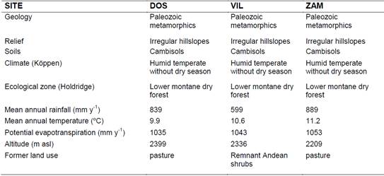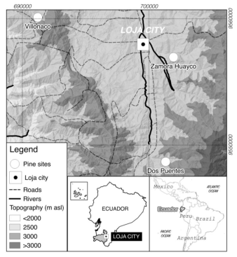 This research was carried out in the province of Loja at southern Andean region of Ecuador. Three sites of pine plantations (Pinus patula) known as Dos Puentes (DOS), Villonaco (VIL), and Zamora-Huayco (ZAM) were selected (Figure 1). These plantations are older than 15 years and they are located on the western side of the Andes Mountain Range. Environmental variables for the sites are described in Table 1.