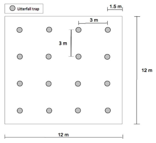 One monitoring square plot of 144 m2 was implemented in each pine (Pinus patula) site. On each square plot, 16 litterfall traps were located. Each trap had a capture area of 900 cm2 and they were installed in a systematic arrangement (Figure 2). The sampling frequency was 15 days (+/- 24 hours) to collect the litterfall material, and the total collection period was five months, from June to October 2014.