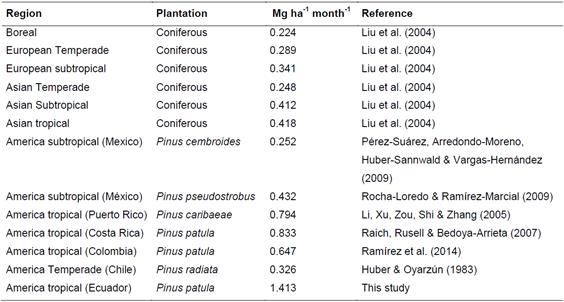 On the other hand, this research revealed the highest monthly values of litterfall production (average mean value: 1413 kg ha-1) for the American tropical region, but it must be taken into account that this value reflects an average estimation based on a fraction of the year (from June to October) and the litter production may also present temporal variations over the year (Osman, 2013). Under this context, this high value probably coincided with a period of high production into the year. Therefore, it is necessary to address further research to assess the litterfall production based on a larger period like one year, in this regard Proctor (1983) stated that an evaluation of data along one year could be enough to bring representative information for this goal. Nevertheless, the reported data in this study give us an overview of the large production of litterfall that is generated in the Ecuadorian Andean region under pine plantations.