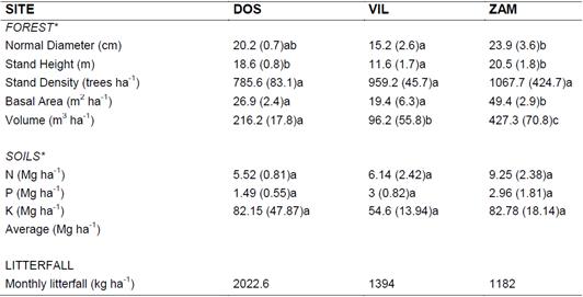 Regarding with the variability of litterfall production among pine plantation sites (DOS, ZAM, VIL), the largest value of monthly litterfall production was reported by DOS (1907 kg ha-1 month-1). However, no statistically significant differences were found among them (Kruskal-Wallis, P>0.05). Also, statistical differences on soil nutrient stocks were not detected (Table 3), meaning that under the site conditions of this study, soils is not influencing the litterfall production. On the other hand, the effect of forest structural attributes was only present in the stand density (Table 3). Thus, there is an increasing litterfall production with decreasing density, this type of trend is not expected because studies of thinning (a type of reduction of stand density) effects, like the recent work of Jiménez & Navarro (2016) in pine plantations of similar age to this study, have reported an increased amount of litterfall with the increase of stand density. Our findings suggest that the litterfall production in the study area could be affected by other factors than forest structure and soils; probably it will be the climate due to the effect of dryness as explained in the section of the dynamic of litterfall.