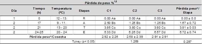 1 Letras minúsculas distintas en una misma columna denotan diferencias estadísticas significativas de la pérdida de peso entre las etapas y letras iguales no hay diferencias. Empleando prueba Tukey p<0.05.