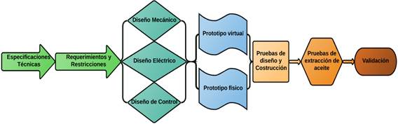 Resumen: Este trabajo presenta el diseño de un extractor de aceite a partir de la semilla de Sacha Inchi a través de un mecanismo de tornillo extrusor, permite alcanzar un rendimiento máximo del 34% mediante un proceso continuo de extracción en frío con temperaturas de trabajo inferiores a 45 °C. La temperatura es un parámetro crítico ya que al superar los 50 °C, el aceite disminuye su valor alimenticio, por la pérdida de sus propiedades más importantes como son: el contenido de Omega 3 (48%), Omega 6 (36%), Omega 9 (8%), digestibilidad (96%), vitamina A y E. La metodología utilizada para el desarrollo de trabajo fue la de diseño concurrente y simultaneo de acuerdo con las recomendaciones de National Instruments. El prototipo implementado está compuesto por un tornillo extrusor, un dado de presión, cámara de alimentación, tamiz y filtro. La ventaja del diseño modular es su flexibilidad, por lo que, al cambiar determinados componentes es posible utilizar el prototipo para extraer aceite de diferentes tipos y tamaños de semillas. Los productos resultantes son: 33.34% de aceite y un residuo sólido conocido como Torta en un 66.66% que tiene muchas aplicaciones en el campo de la alimentación humana y de mascotas. Debido a que se está procesando un producto alimenticio se tomó en cuenta los requerimientos de la Norma ISO 22005 para el diseño y la implementación del prototipo.