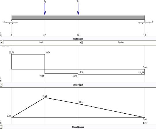 Con estos datos se obtienen los diagramas de fuerza cortante y momento flector de la viga como se muestra en la Figura 5.