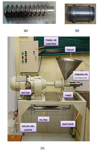 En la Figura 6 se muestra el tornillo, la cámara de extracción (tipo tamiz) y el prototipo completo del extractor de aceite con todos sus componentes: