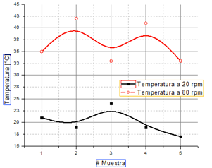 Como resultado de las pruebas se obtuvo la temperatura en el interior del mecanismo para cada una de las muestras que alimentaron el dispositivo a velocidades del tornillo de 20 y 80 rpm. Los datos se pueden observar en la Figura 7.