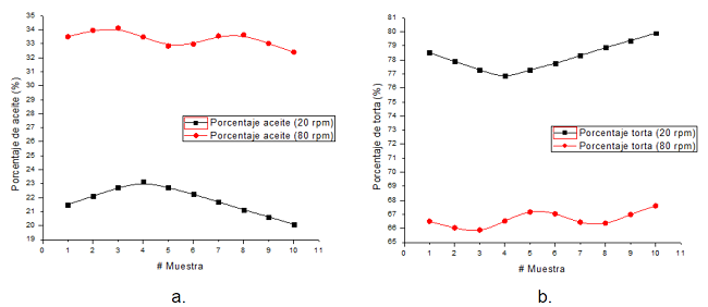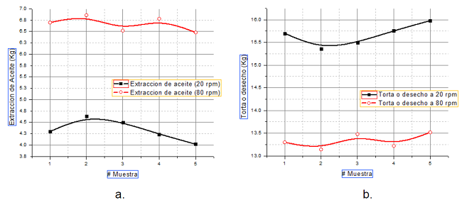 El trabajo del prototipo a velocidades de 20 y 80 rpm, no superó en ninguna prueba la temperatura crítica de 45±1°C, por lo cual 80 rpm es la velocidad recomendable para la extracción, y permite obtener el mayor rendimiento dentro de los rangos de temperatura para mantener intactas las características y propiedades físico-químicas del aceite.