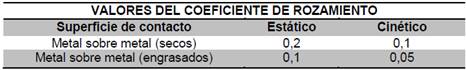 En la Tabla 5 se presentan los coeficientes de rozamiento de acuerdo con la superficie de contacto.